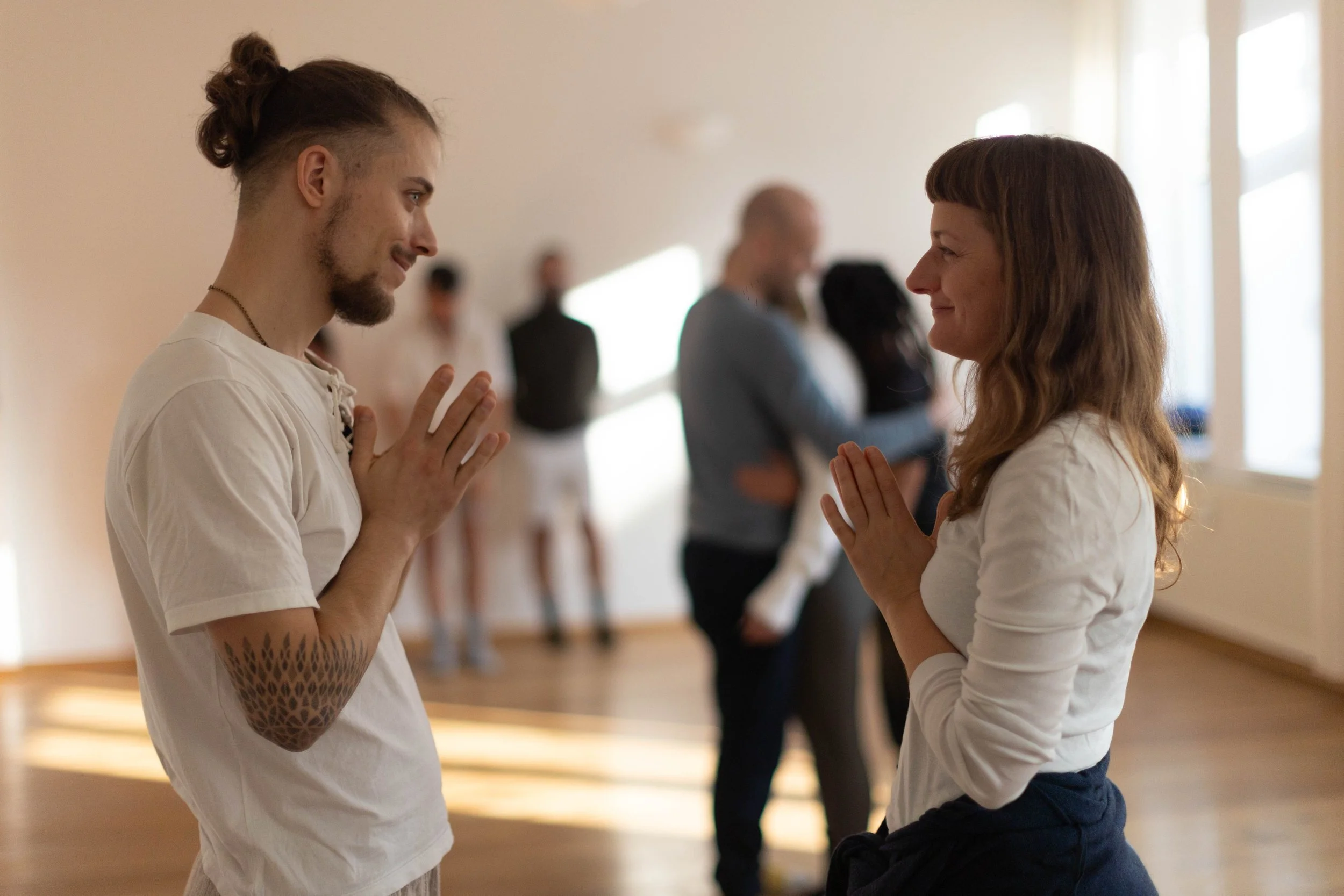 • I aim to keep the energy balanced in the room. Though, it can not be guaranteed that there will always be a woman available to work with you. In this case, you can either do the exercise by yourself or, by choice, with another man. Both cases offer the opportunity for self-exploration.